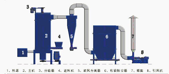 又稱閃蒸干燥機,GQF型系列強力粉碎干燥機是在參考國內(nèi)外快速干燥設(shè)備的基礎(chǔ)上,我公司自行開發(fā),集粉碎、干燥一機完成。該機不僅干燥熱效率高,而且簡化工序,節(jié)省占地面積,節(jié)約投資。濕物料由送料裝置送入干燥機內(nèi),拋到高速旋轉(zhuǎn)的粉碎葉輪上受到強力粉碎,同時濕物料與粉碎葉輪下方向上的高溫空氣進行接觸、干燥。物料顆粒邊干燥、邊粉碎,其尺寸不斷減少,細粉及小顆粒物料在熱風作用下被帶向干燥機上方的分級葉輪處進行分級。由于分級葉輪旋轉(zhuǎn)時(轉(zhuǎn)速可調(diào))產(chǎn)生向下的壓力和離心力,大顆粒物料沉降到粉碎葉輪處繼續(xù)被粉碎和干燥,已干燥的細粉通過分級后由除塵系統(tǒng)收集。